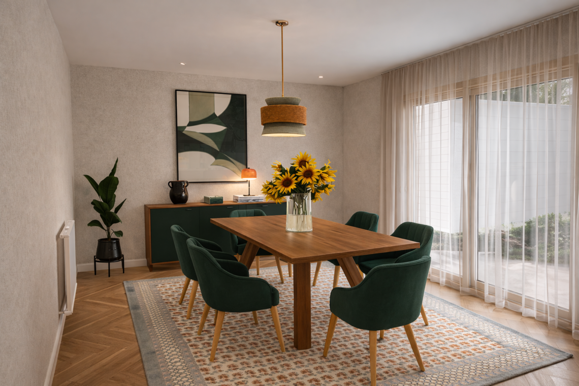 Η τραπεζαρία επιστρέφει δυναμικά ως χώρος συνάντησης και επικοινωνίας μέσα στο σπίτι. Τα μεγάλα ξύλινα τραπέζια, συχνά σε φυσική απόχρωση δρυός ή καρυδιάς, αποτελούν το κεντρικό στοιχείο του χώρου.