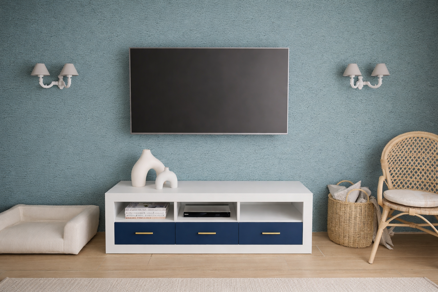 • Υλικά Κατασκευής: Πολυτελές MDF υψηλής ποιότητας που εγγυάται αντοχή και μακροχρόνια χρήση. Η λευκή λακαρισμένη επιφάνεια προσφέρει κομψότητα και ευκολία στον καθαρισμό, ενώ το ματ μπλε φινίρισμα στα συρτάρια: Ανθεκτικό στις γρατσουνιές και την καθημερινή χρήση.