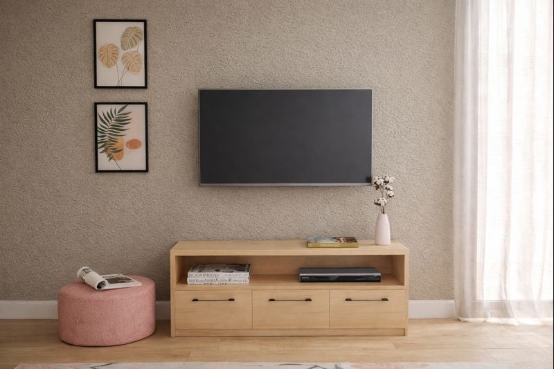 - Χώροι Αποθήκευσης: Τα δύο κλειστά συρτάρια είναι ιδανικά για την αποθήκευση τηλεχειριστηρίων, καλωδίων και άλλων μικροαντικειμένων με το ανοιχτό ράφι να προσφέρει χώρο για συσκευές πολυμέσων, όπως κονσόλες ή αποκωδικοποιητές.
