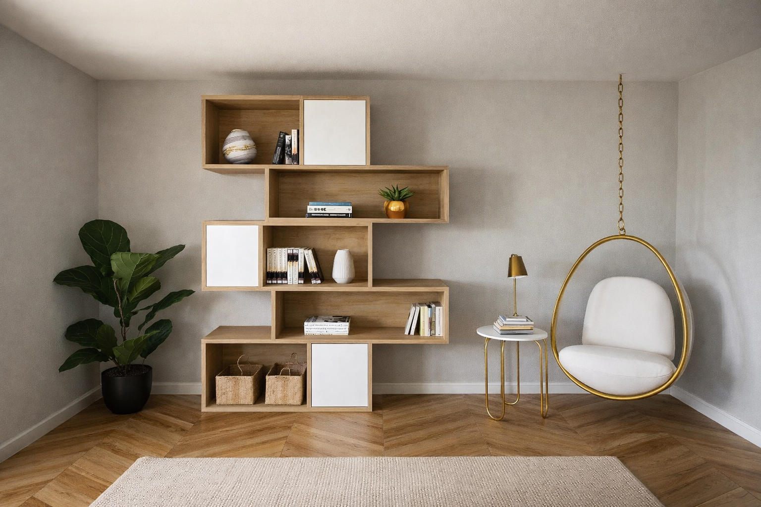 • Αποθηκευτικοί Χώροι: Ασύμμετρα ράφια με έξι διαφορετικά τμήματα για την τοποθέτηση βιβλίων, διακοσμητικών και προσωπικών αντικειμένων. Κλειστά τμήματα με δύο λευκά πάνελ που κλείνουν για την προστασία ή την απόκρυψη αντικειμένων. Χώρος για Καλάθια σε χαμηλά τοποθετημένους χώρους που φιλοξενεί διακοσμητικά καλάθια ή κουτιά αποθήκευσης.