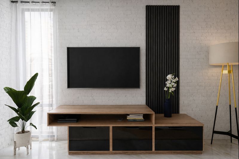 - Χώροι Αποθήκευσης: Τρία κλειστά ντουλάπια με γυαλιστερές προσόψεις για την αποθήκευση συσκευών, καλωδίων και προσωπικών αντικειμένων. Ανοιχτά ράφια ιδανικά για τη φιλοξενία συσκευών πολυμέσων, όπως κονσόλες, αποκωδικοποιητές ή διακοσμητικά αντικείμενα. Ευρύχωρη επιφάνεια που παρέχει αρκετό χώρο για τηλεόραση, διακοσμητικά ή βιβλία.