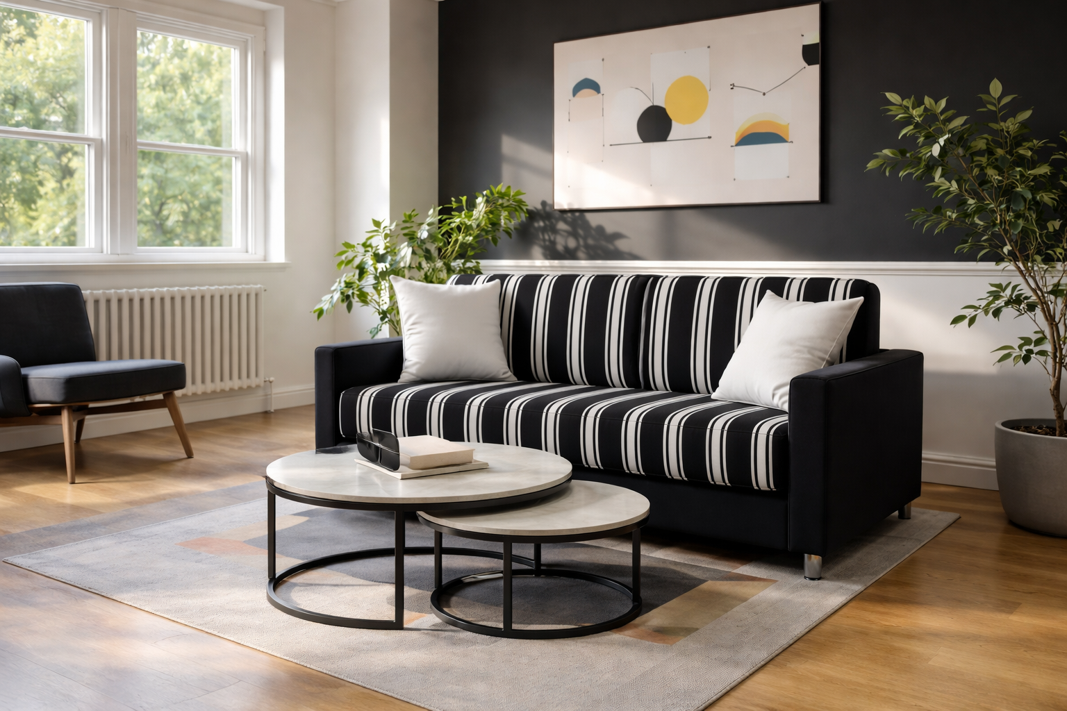 Ο καναπές Άντζελα χαρακτηρίζεται από μοντέρνο σχεδιασμό με καθαρές γραμμές και ουδέτερους τόνους, καθιστώντας τον ιδανικό για κάθε διακόσμηση εσωτερικού χώρου. Το ύφασμα του καναπέ, με τις διακριτικές ρίγες, προσδίδει αίσθηση κομψότητας και μοντέρνου στυλ.