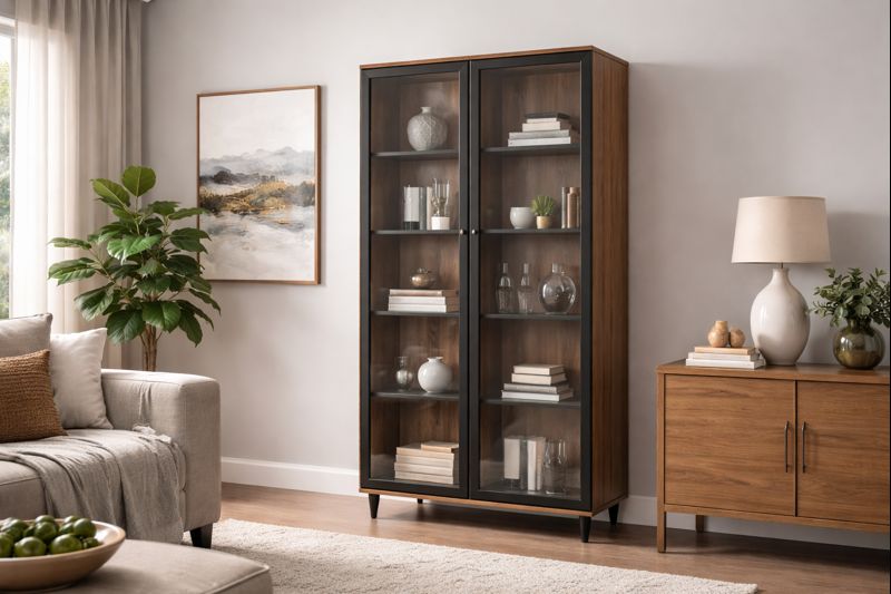 • Λεπτομέρειες Σχεδίασης: Το μαύρο πλαίσιο γύρω από τις γυάλινες πόρτες ενισχύει τον σύγχρονο σχεδιασμό της βιτρίνας, δημιουργώντας μια εντυπωσιακή αντίθεση με το ξύλο και προσθέτοντας ένα διακριτικό τόνο πολυτέλειας. Με καθαρές γραμμές και μινιμαλιστικό στυλ, η “AMUSEMENT” ενσωματώνεται εύκολα σε διάφορα διακοσμητικά στυλ, από μοντέρνο έως και κλασικό. Η βιτρίνα στηρίζεται σε τέσσερα διακριτικά πόδια, τα οποία προσδίδουν σταθερότητα στο έπιπλο και προσθέτουν ελαφρότητα στον σχεδιασμό του.