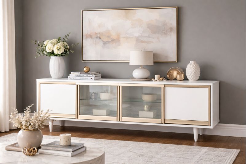 - Κατασκευή και Υλικά: Ο μπουφές “BLISS” είναι κατασκευασμένος από MDF υψηλής αντοχής, το οποίο εξασφαλίζει σταθερότητα και μακροχρόνια ανθεκτικότητα. Ο μπουφές διαθέτει γυάλινες πόρτες με πλαίσιο, οι οποίες προσθέτουν μια αίσθηση διαφάνειας και κομψότητας, επιτρέποντας την ανάδειξη των αντικειμένων στο εσωτερικό του. Το ματ λευκό φινίρισμα σε συνδυασμό με τις διακριτικές χρυσές λεπτομέρειες γύρω από τις γυάλινες επιφάνειες προσδίδουν έναν πολυτελή χαρακτήρα και ενισχύουν τη σύγχρονη εμφάνιση του επίπλου.