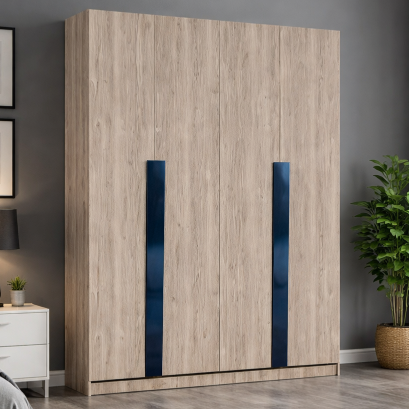 - Λεπτομέρειες: Κατακόρυφα μπλε γυαλιστερά πάνελ που προσδίδουν μοντέρνο και μοναδικό χαρακτήρα στην εμφάνιση της ντουλάπας.