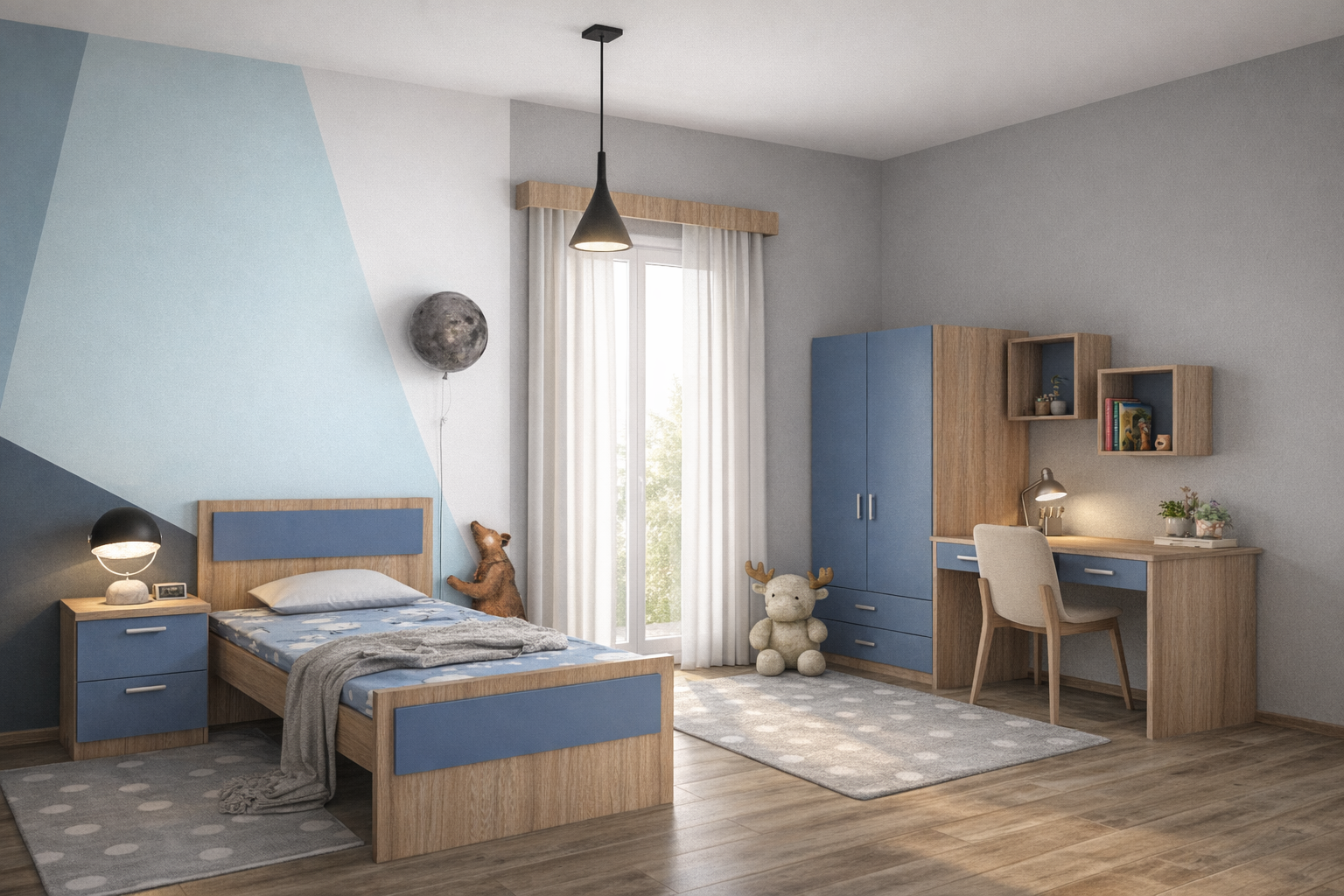 Το κεντρικό στοιχείο του δωματίου είναι το άνετο μονό κρεβάτι με κομψό ξύλινο πλαίσιο και κεφαλάρι, πλαισιωμένο από ένα ευρύχωρο κομοδίνο με δύο συρτάρια για προσωπικά αντικείμενα. Το γραφείο προσφέρει μεγάλο χώρο για διάβασμα, εργασία και δημιουργικές δραστηριότητες, ενώ τα ενσωματωμένα ράφια και τα ντουλάπια παρέχουν επιπλέον χώρο αποθήκευσης. Το δωμάτιο ολοκληρώνεται με μια κομψή δίφυλλη ντουλάπα, που προσφέρει άπλετο χώρο για ρούχα και αξεσουάρ.