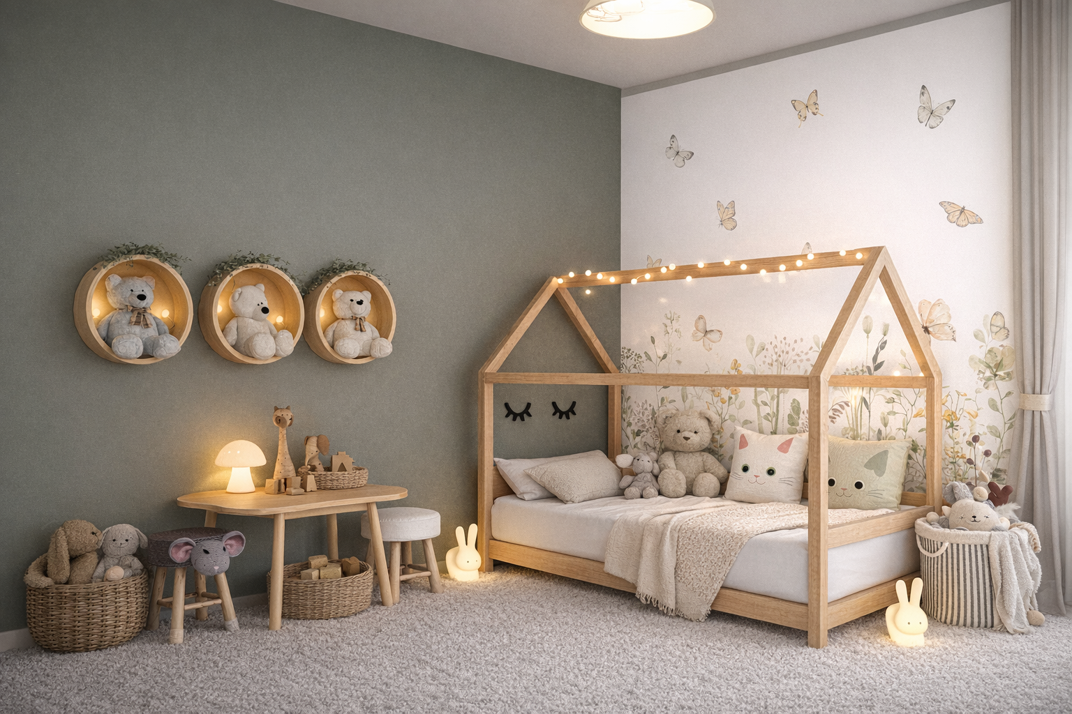Ο χώρος περιλαμβάνει έναν συνδυασμό λειτουργικών και αισθητικών στοιχείων. Η ενσωμάτωση ραφιών σε σχήμα σπιτιού, διακοσμητικών στοιχείων και απαλών χρωμάτων δημιουργεί μια ήρεμη και ζεστή ατμόσφαιρα. Το γραφείο και η καρέκλα παρέχουν τον ιδανικό χώρο για τις πρώτες δημιουργικές δραστηριότητες του παιδιού, ενώ η γωνιά παιχνιδιού με χαλάκι και μαξιλάρια προσφέρει έναν άνετο χώρο για παιχνίδι και χαλάρωση.