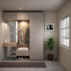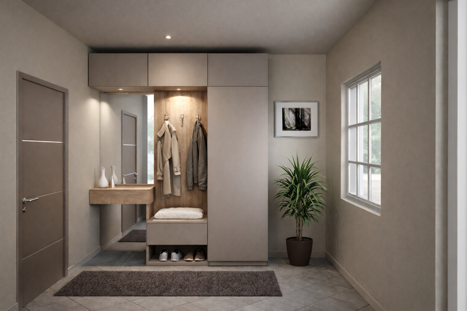 Διαθέτει ντουλάπια και συρτάρια για αποθήκευση, ενσωματωμένο πάγκο καθίσματος με άνετο μαξιλάρι, καθώς και διακριτικούς γάντζους για ρούχα και αξεσουάρ. Ο φωτισμός LED στον κεντρικό πίνακα από ξύλο προσδίδει ατμοσφαιρικότητα και λειτουργικότητα. Ένας καθρέφτης με απλό πλαίσιο συμπληρώνει το έπιπλο, προσφέροντας φως και τη δυνατότητα να ετοιμάζεστε πριν φύγετε από το σπίτι.
