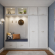 Το έπιπλο περιλαμβάνει ντουλάπια αποθήκευσης στο επάνω και κάτω μέρος, ανοιχτά ράφια για διακοσμητικά αντικείμενα και έναν άνετο πάγκο με ξύλινη επένδυση, ιδανικό για να κάθεστε και να οργανώνετε τα προσωπικά σας αντικείμενα. Οι μεταλλικές λεπτομέρειες στους χειροποίητους γάντζους και τις λαβές προσθέτουν μια μοντέρνα, βιομηχανική αισθητική, ενώ ο φωτισμός τύπου LED ενισχύει τη λειτουργικότητα και τη διακόσμηση.