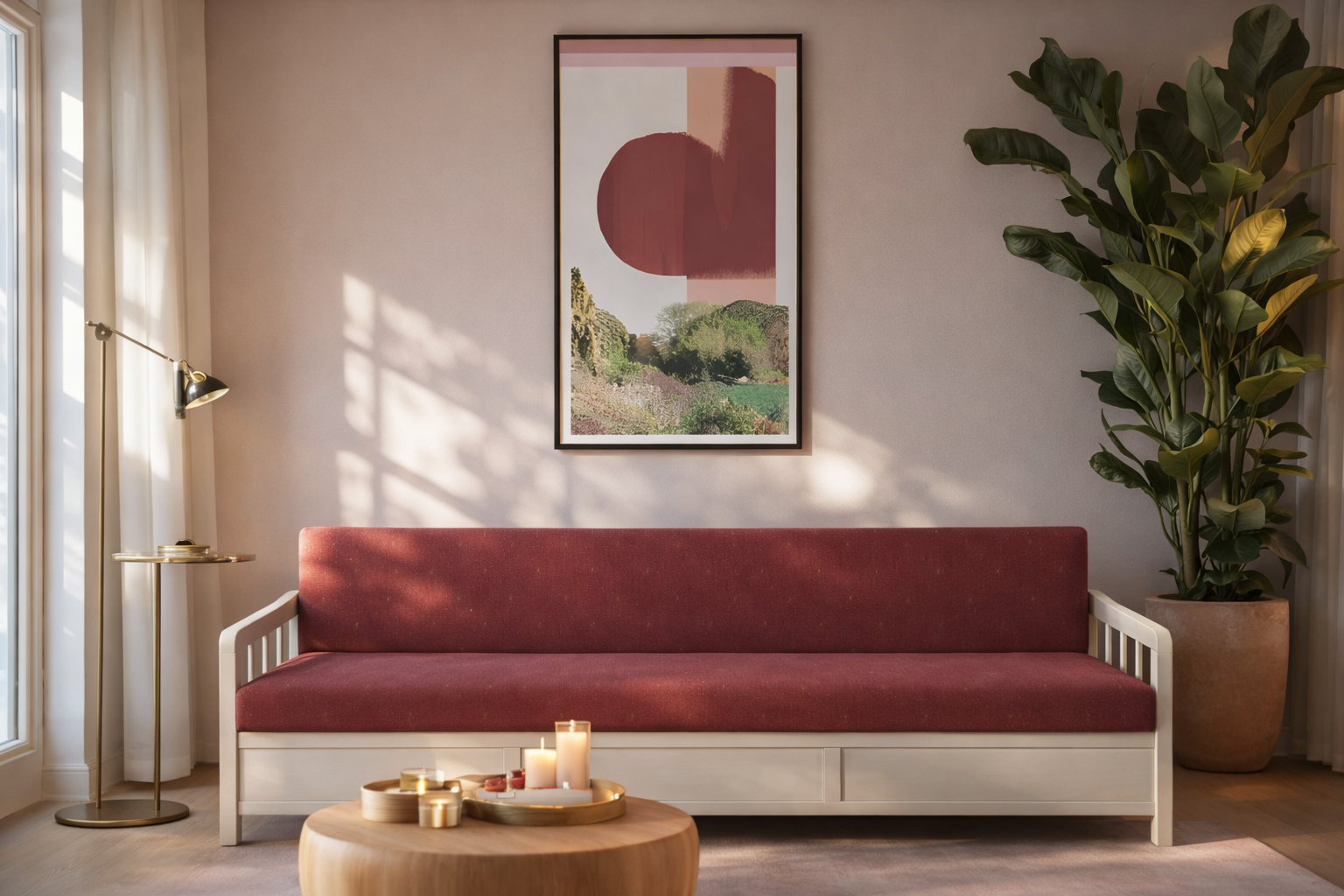 - Χρώματα: Φυσικό ξύλο που συνδυάζεται αρμονικά με το ύφασμα σε θερμές αποχρώσεις.