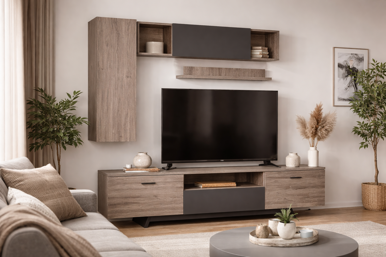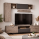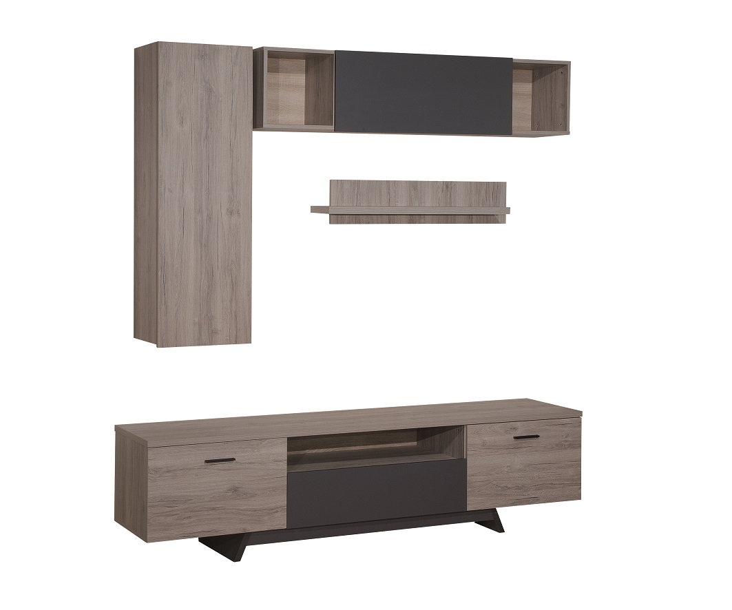 - Κατασκευή και Υλικά: Το σύνθετο είναι κατασκευασμένο από υψηλής ποιότητας ξύλο με φυσικό φινίρισμα που αναδεικνύει την υφή και το χρώμα του, δίνοντας μια γήινη αίσθηση που ταιριάζει σε μοντέρνους και κλασικούς χώρους. Οι μαύρες μεταλλικές λαβές προσθέτουν έναν σύγχρονο τόνο στη σύνθεση, δημιουργώντας κομψή αντίθεση με το φυσικό ξύλο και ενισχύοντας τη μοντέρνα αισθητική.