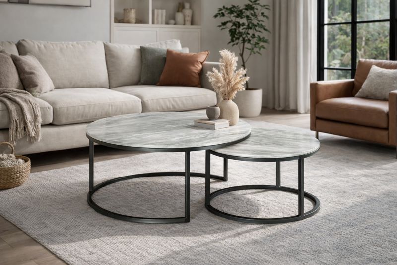 Η επιφάνεια διαθέτει εφέ φυσικής πέτρας / μαρμάρου, με διακριτικά νερά και απαλούς τόνους, προσδίδοντας αίσθηση πολυτέλειας χωρίς υπερβολές. Το στρογγυλό σχήμα μαλακώνει τον χώρο και δημιουργεί μια φιλόξενη ατμόσφαιρα, ιδανική για χαλαρά καθιστικά και σύγχρονες συνθέσεις.