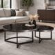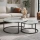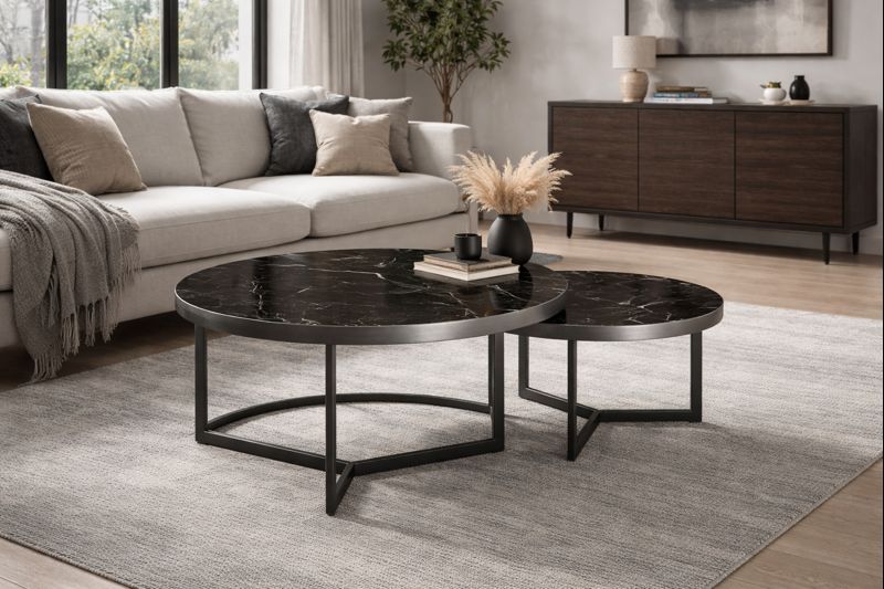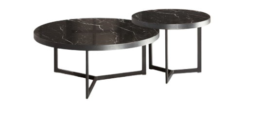 Πρόκειται για σετ δύο στρογγυλών τραπεζιών διαφορετικού μεγέθους, τα οποία μπορούν να τοποθετηθούν μαζί σε επικάλυψη ή ξεχωριστά, προσφέροντας ευελιξία και λειτουργικότητα. Η στρογγυλή επιφάνεια με μαρμάρινη όψη σε σκούρα απόχρωση και έντονα φυσικά νερά προσδίδει αίσθηση πολυτέλειας και βάθους στον χώρο, χωρίς να βαραίνει οπτικά το σύνολο.
