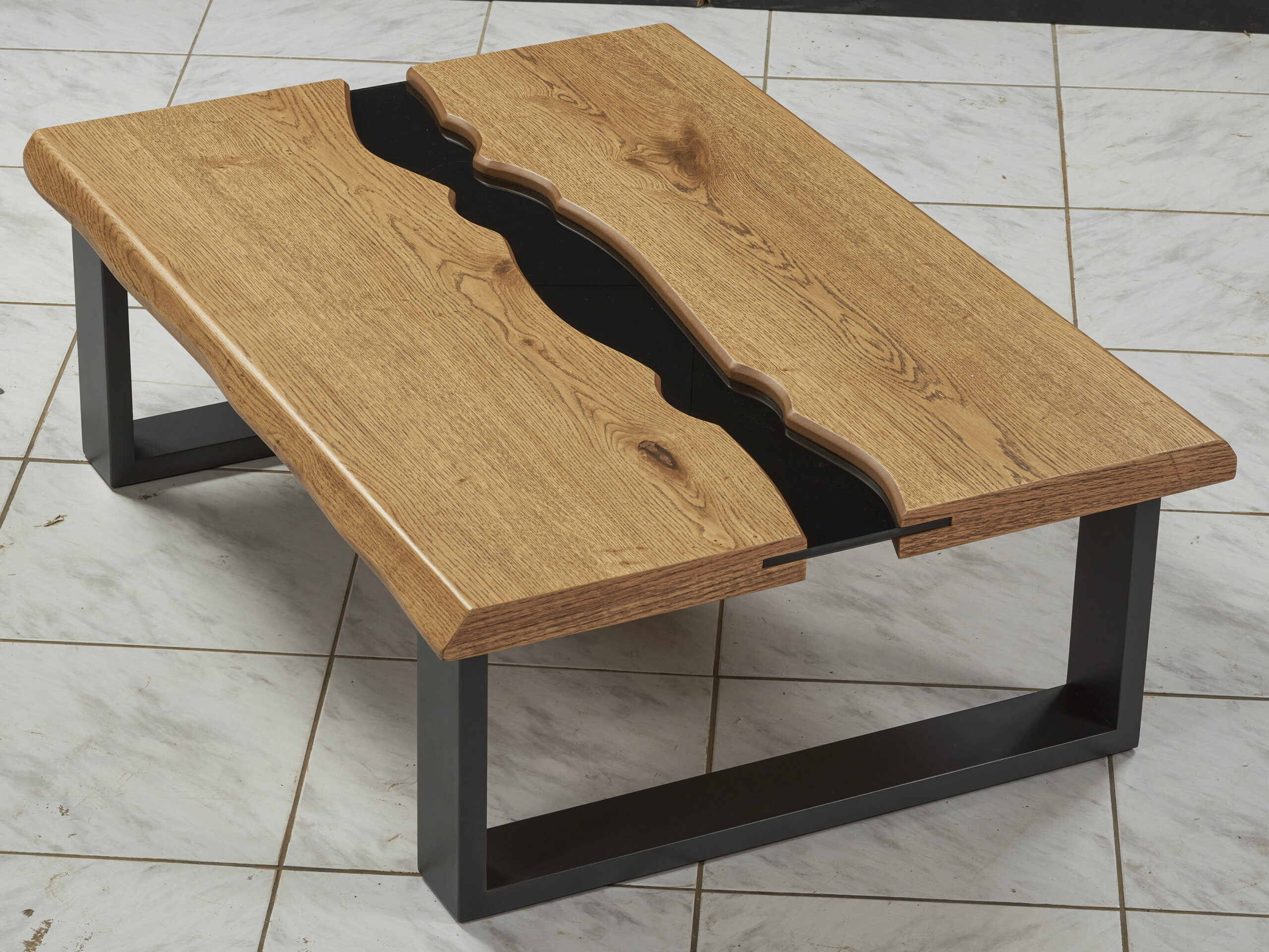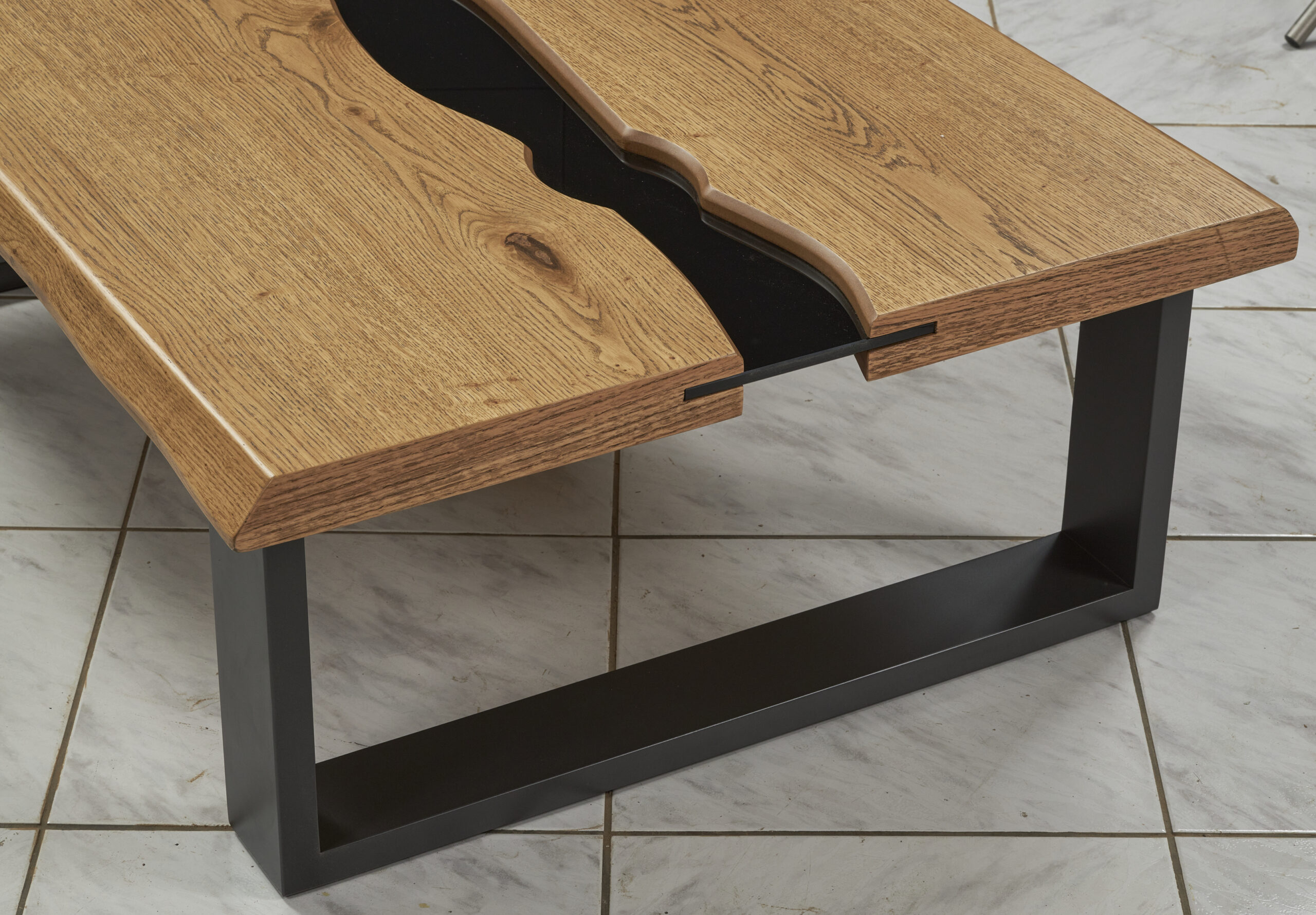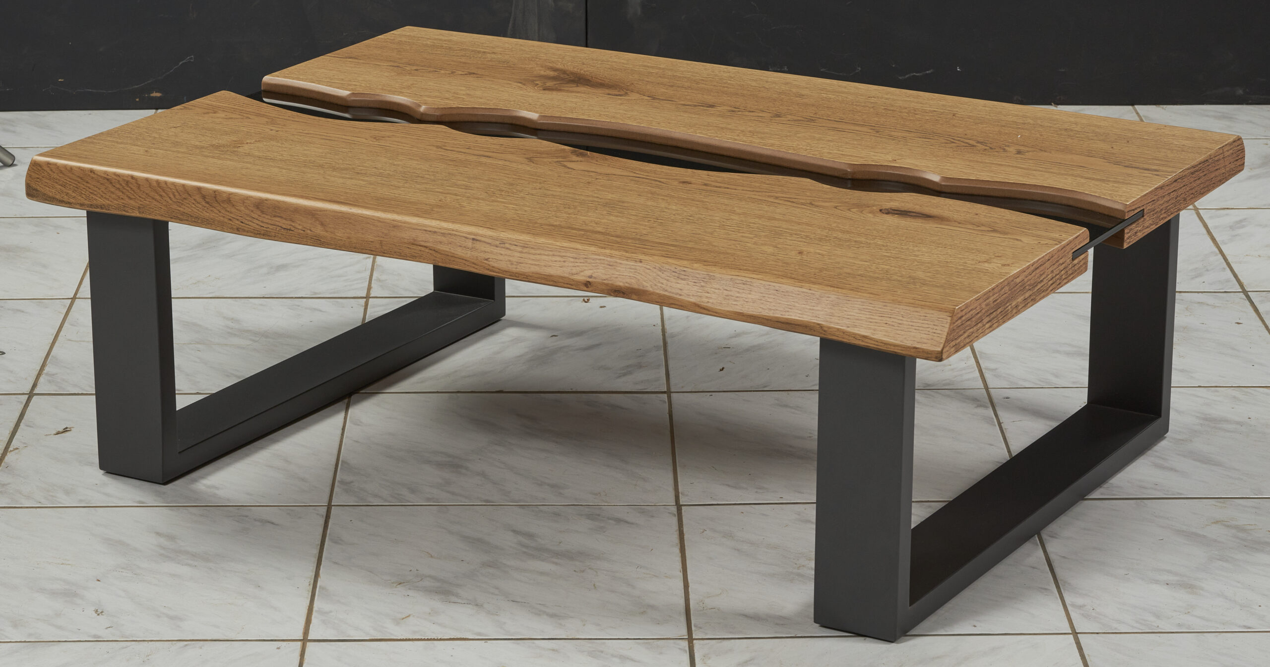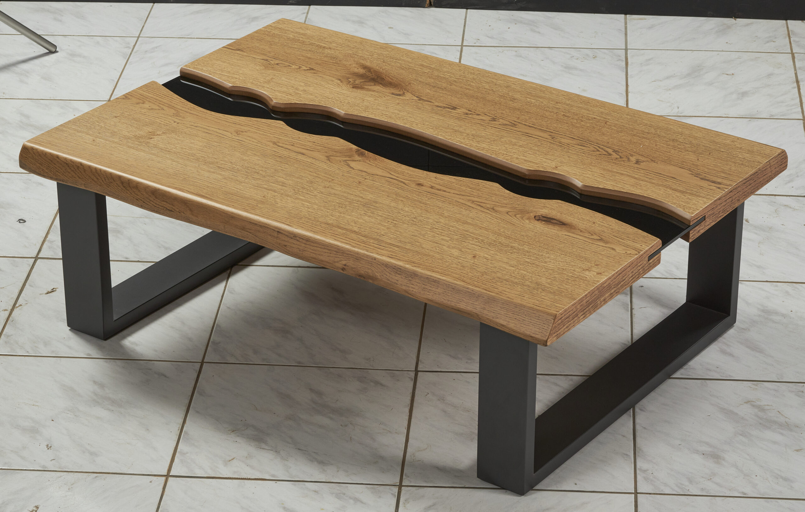 Η βάση του τραπεζιού αποτελείται από μεταλλικά πόδια σε σχήμα Π, σε σκούρα απόχρωση, τα οποία εξασφαλίζουν εξαιρετική σταθερότητα και αντοχή, ενώ παράλληλα προσδίδουν industrial και σύγχρονο χαρακτήρα. Η στιβαρή κατασκευή επιτρέπει καθημερινή χρήση χωρίς φθορές, ενώ το ύψος και οι αναλογίες του το καθιστούν ιδανικό για άνετη χρήση μπροστά από τον καναπέ.