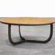 Το σετ περιλαμβάνει δύο τραπέζια με ακανόνιστες, οργανικές επιφάνειες. Η κύρια επιφάνεια διαθέτει επένδυση από φυσικό καπλαμά, ενώ τα περιγράμματα είναι βαμμένα σε έντονο κίτρινο χρώμα, προσφέροντας έναν τολμηρό χρωματικό συνδυασμό. Τα πόδια είναι κατασκευασμένα από μασίφ ξύλο με διακριτική κλίση, προσφέροντας σταθερότητα και κομψότητα.
