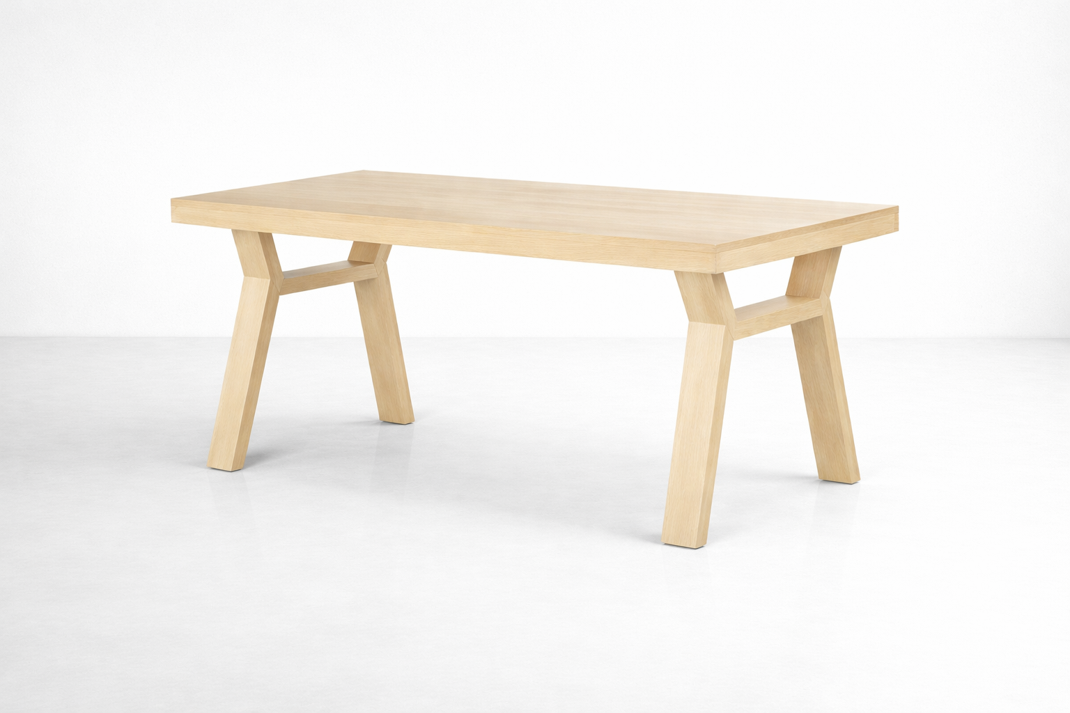 Η επιφάνειά της είναι κατασκευασμένη από MDF υψηλής ποιότητας, επενδεδυμένο με καπλαμά φυσικού ξύλου, που προσφέρει φυσική υφή και διαχρονική αντοχή. Τα στιβαρά πόδια από μασίφ ξύλο ενισχύουν τη δομή της τραπεζαρίας, ενώ ο σχεδιασμός τους σε σχήμα “Υ” δίνει την αίσθηση ελαφρότητας και μοντέρνας αισθητικής. Το φινίρισμα της τραπεζαρίας με οικολογικά βερνίκια προστατεύει από γρατζουνιές, λεκέδες και υγρασία, διατηρώντας τη φυσική της εμφάνιση αναλλοίωτη.
