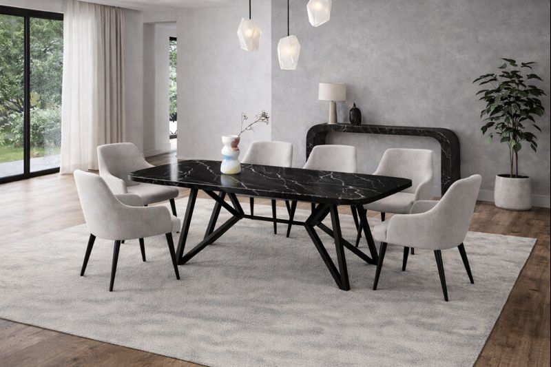 Η επιφάνειά της είναι κατασκευασμένη από ολόμαυρο μάρμαρο, με φυσικές λευκές φλέβες που κάνουν κάθε τραπέζι μοναδικό. Οι ακμές είναι προσεκτικά επεξεργασμένες, με ελαφρώς στρογγυλεμένο τελείωμα, προσφέροντας άνεση στη χρήση και αυξημένη αντοχή στον χρόνο. Το μάρμαρο αναδεικνύεται μέσα από τη λιτή γεωμετρία του τραπεζιού και δημιουργεί μια αίσθηση διακριτικής πολυτέλειας χωρίς υπερβολές.