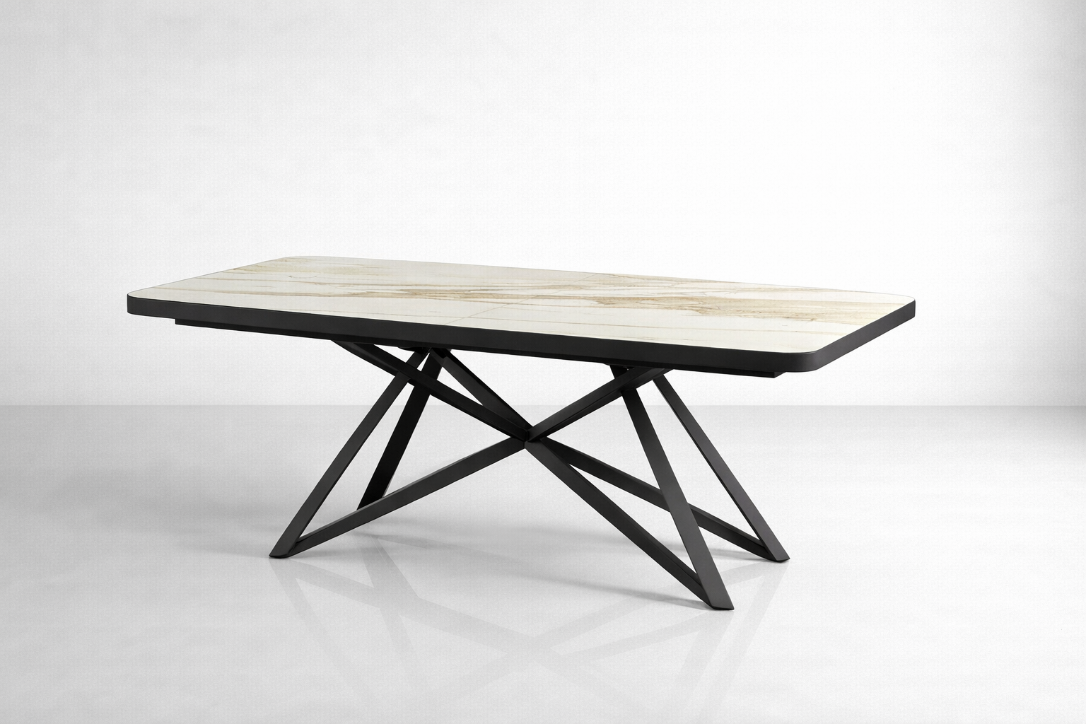 Η βάση αποτελείται από μεταλλικό σκελετό υψηλής αντοχής, βαμμένο σε μαύρη ηλεκτροστατική βαφή. Ο γεωμετρικός σχεδιασμός των ποδιών προσφέρει εξαιρετική σταθερότητα, ενώ παράλληλα αφήνει τον χώρο “ανοιχτό”, διευκολύνοντας την τοποθέτηση καρεκλών και την άνετη κίνηση γύρω από το τραπέζι.