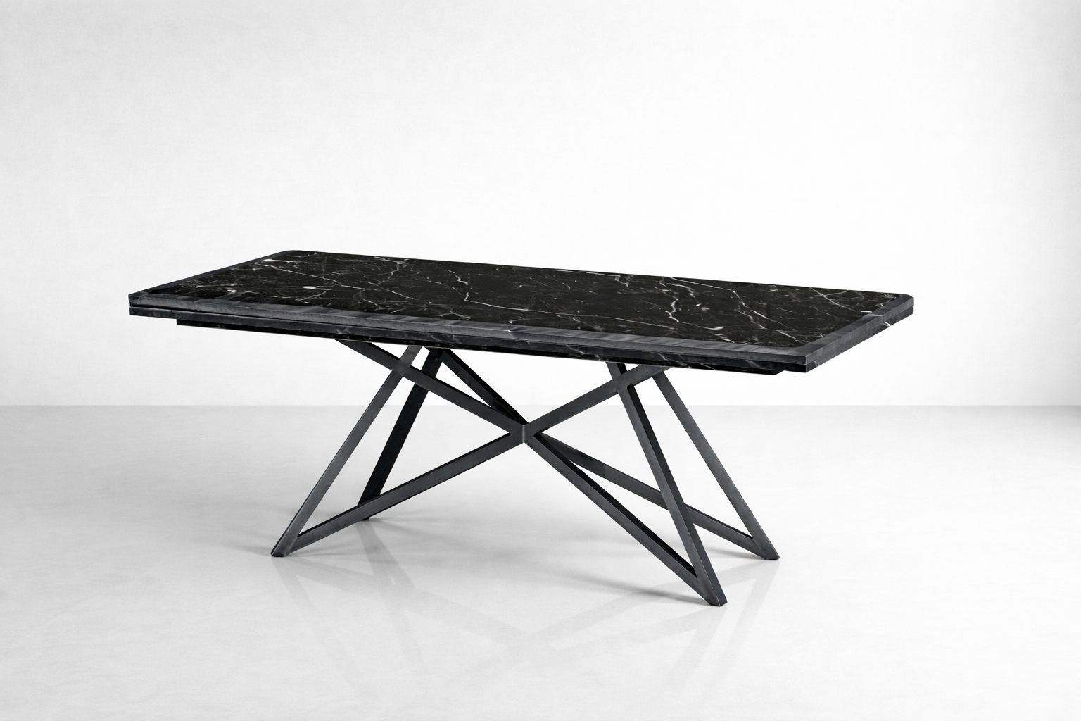 Η βάση της τραπεζαρίας αποτελεί ένα από τα πιο δυναμικά της στοιχεία: μεταλλική κατασκευή σε μαύρο ματ φινίρισμα, με σταυρωτή γεωμετρία (Χ), που εξασφαλίζει απόλυτη σταθερότητα και παράλληλα λειτουργεί ως έντονο αρχιτεκτονικό στοιχείο. Ο σχεδιασμός της επιτρέπει άνετη τοποθέτηση καρεκλών χωρίς περιορισμούς στα πόδια των καθήμενων.